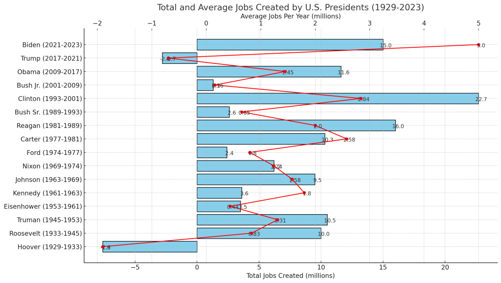 The horizontal bar chart represents the total number of jobs created (in millions) during each president’s tenure, while the red line with markers indicates the average number of jobs created per year (in millions).