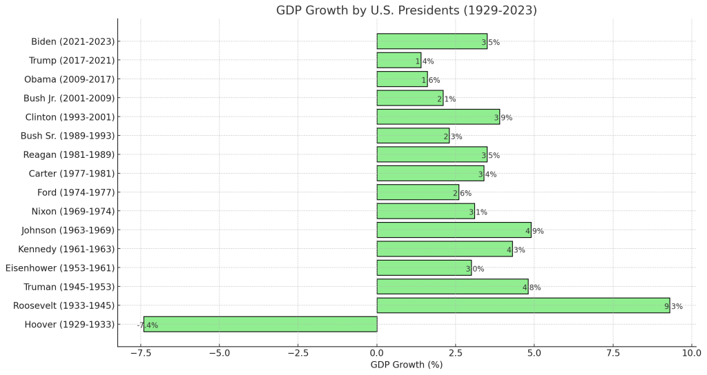 - Democratic administrations, particularly Roosevelt, Kennedy, Johnson, and Clinton, have seen robust GDP growth.