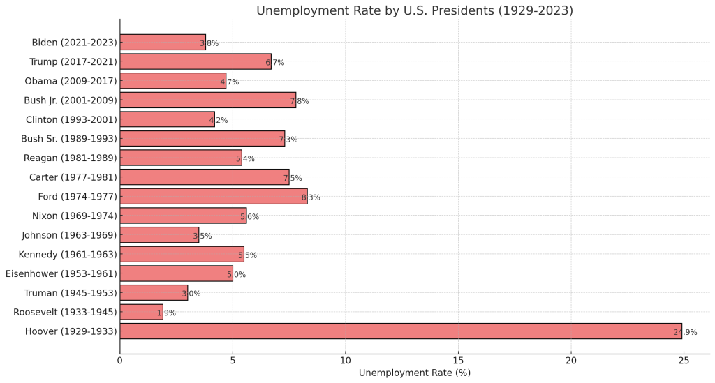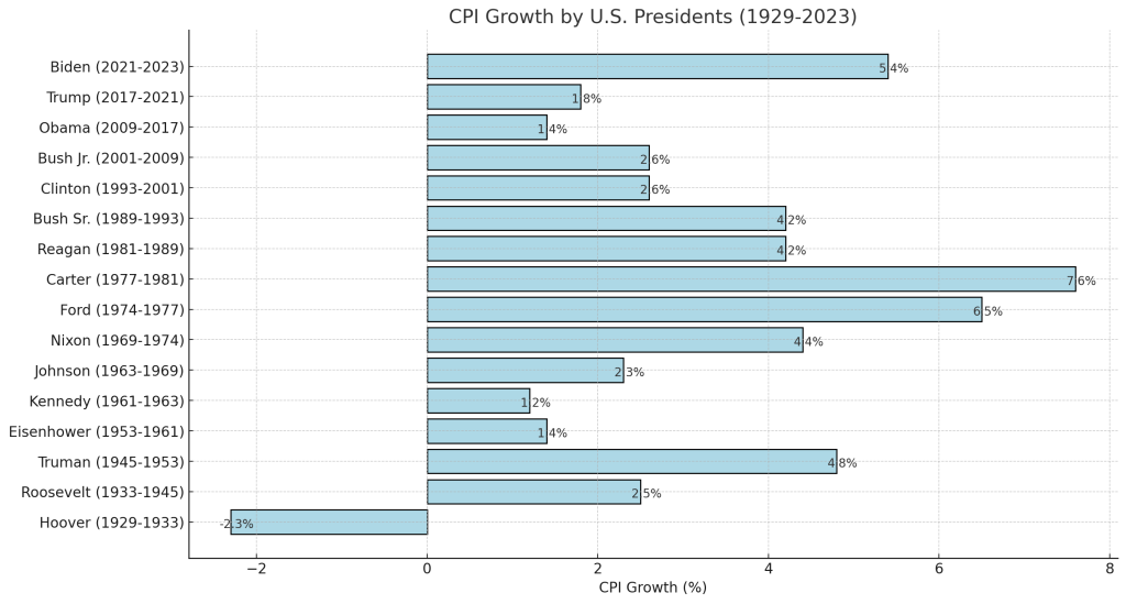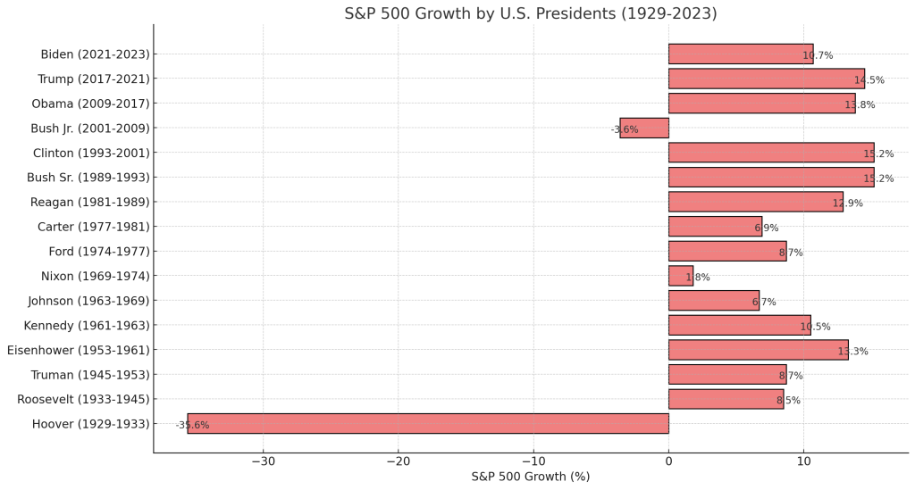 - Republican administrations have experienced moderate growth, with notable exceptions during Hoover’s Great Depression and Bush Jr.’s post-2008 financial crisis period.