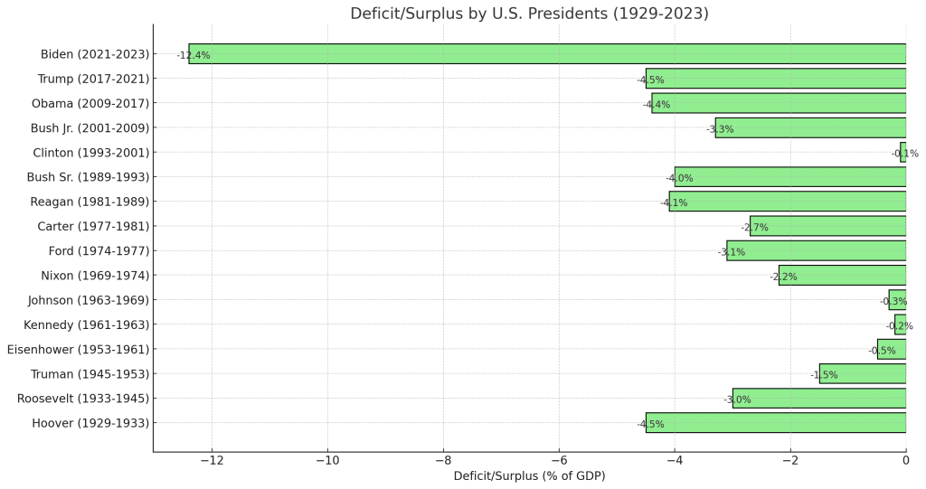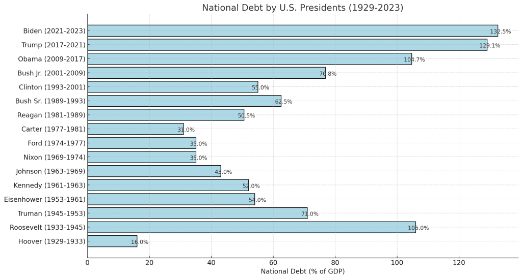 - Significant budget deficits and increases in national debt, especially under Bush Jr. and Trump.