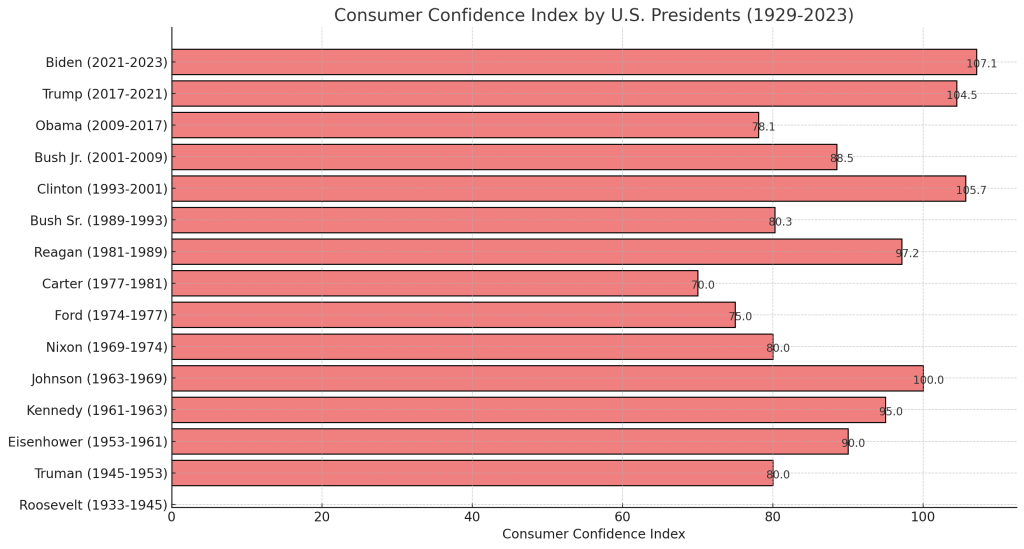This analysis reviews the Consumer Confidence Index (CCI) during the tenures of U.S. presidents from Herbert Hoover to Joe Biden. The CCI is a measure of consumer optimism regarding the state of the economy and their financial situations.