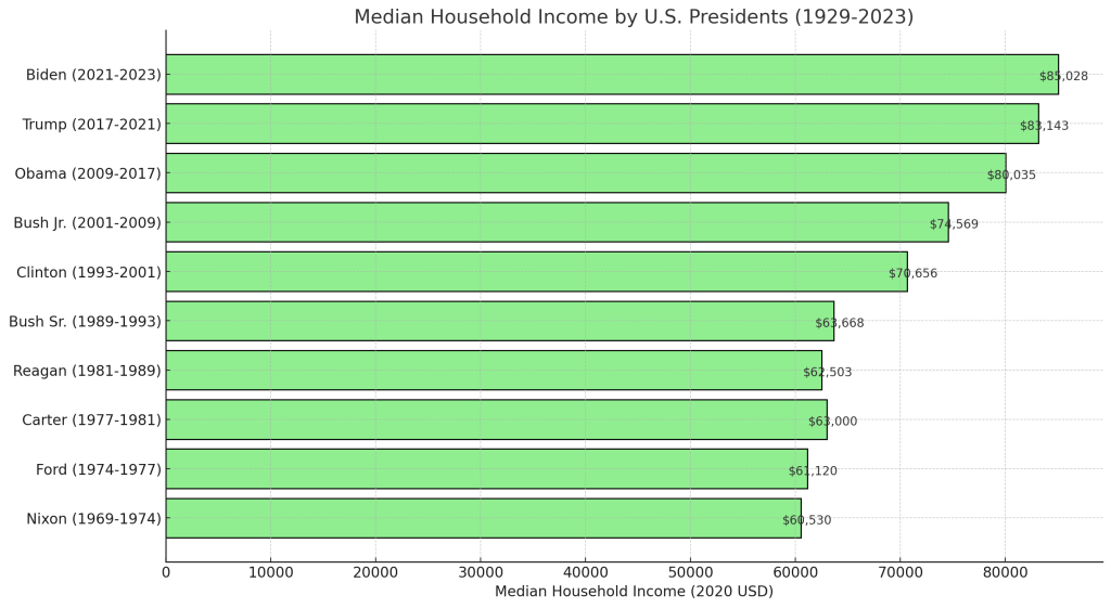 The horizontal bar chart represents the median household income (adjusted to 2020 USD) during each president’s tenure.